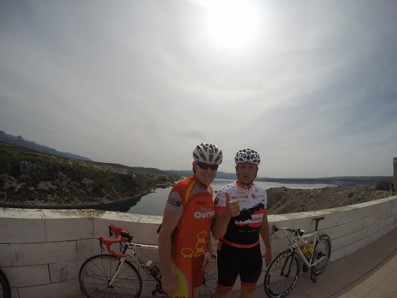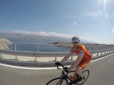 Herrmann buhlt vergeblich um Begleitung für eine „flache“ 200km Runde. Nur Thomas und Hugo fahren mit. Was sonst. Wir fahren mit Erich auf die Insel Pag. Der Erich kennt sich aus: „Langsamer“, „Schnölla“, „Treff ma uns am Higl“, „Oben zamwoartn“ – mehr Kommandos braucht’s auch nicht. Nach Erreichen des „Highways to Pag“ fahren alle voller Euphorie und mit Rückenwind. So muss Rennradfahren sein. Wir genießen das Sein. Die Ortstafel „Pag“ wird gesprintet – die Ankündigung dazu erfolgt 5km davor also zeitgerecht! (Angeblich waren die Rovinj Sprints von 2013 und 2014 nie angesagt) Ich bin mit Erich seit 10km im Wind – wir halten das Tempo hoch. Nach einer Kurve, leicht steigendes Profil, sehen wir schon die Ortstafel: Erich geht aus dem Wind. Ich bin schon in den Pedalen! Schalten, schalten, Treten mit Vollgas. Erst als mir zwei Kollegen im Hafen gratulieren, dämmert mir, dass alle drum gekämpft haben – Geil: 2013 Rovinj, 2014 Rovinj, 2015 Pag. Muss mir glaub ich einen Pokal machen.